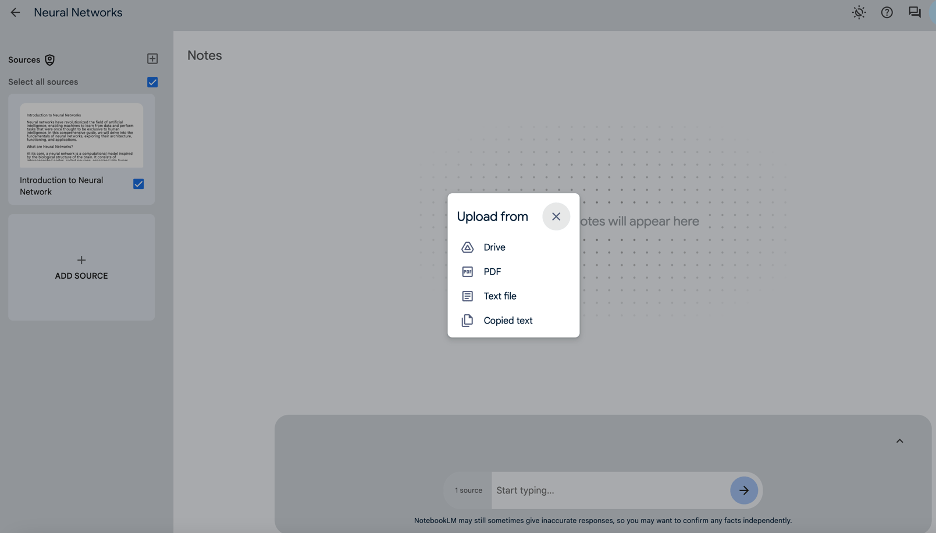 Now, it’s time to feed your notebook with information. Click the “Add Source” button in the left panel and choose your preferred method: