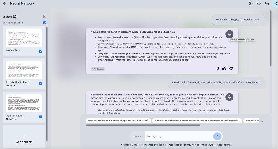 Here’s where the magic happens! With your sources loaded, you can interact with NotebookLM’s AI in several ways:
