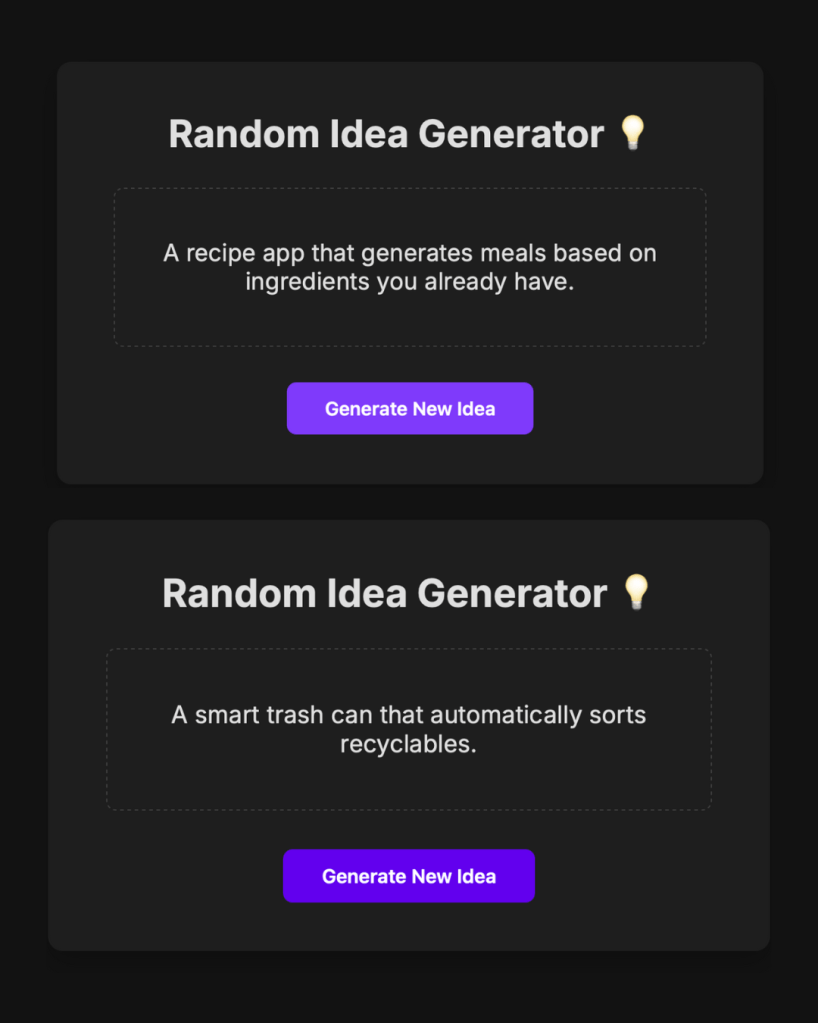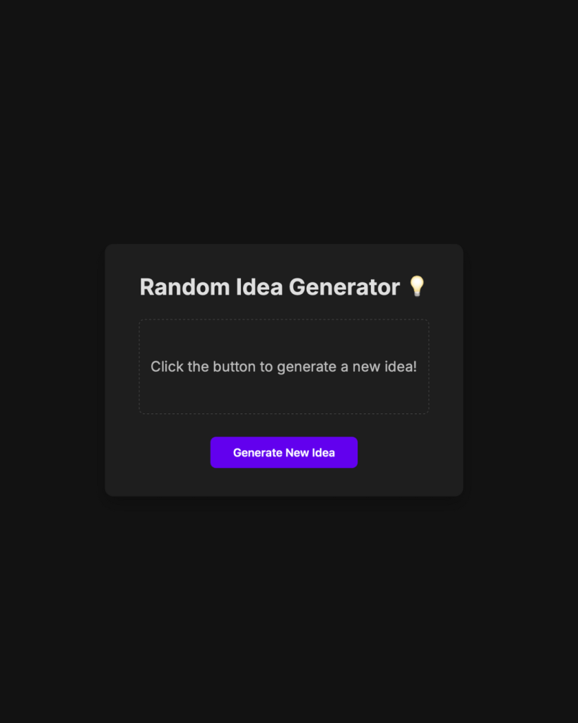 2. **CSS Styling:** The page should have a dark theme. The container should be centered on the page. Use a modern, clean font like ‘Inter’ from Google Fonts. The button should have a distinct, clickable style with a hover effect. The `idea-display` paragraph should have a slightly larger font size.